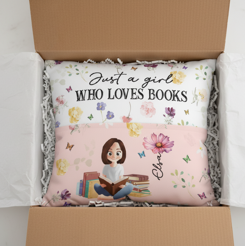 Den här personliga läskudden är perfekt för alla som älskar att krypa upp med en bra bok. Med sitt söta motiv, mjuka färger och praktiska ficka för favoritboken blir den snabbt en favorit i soffan eller sängen.