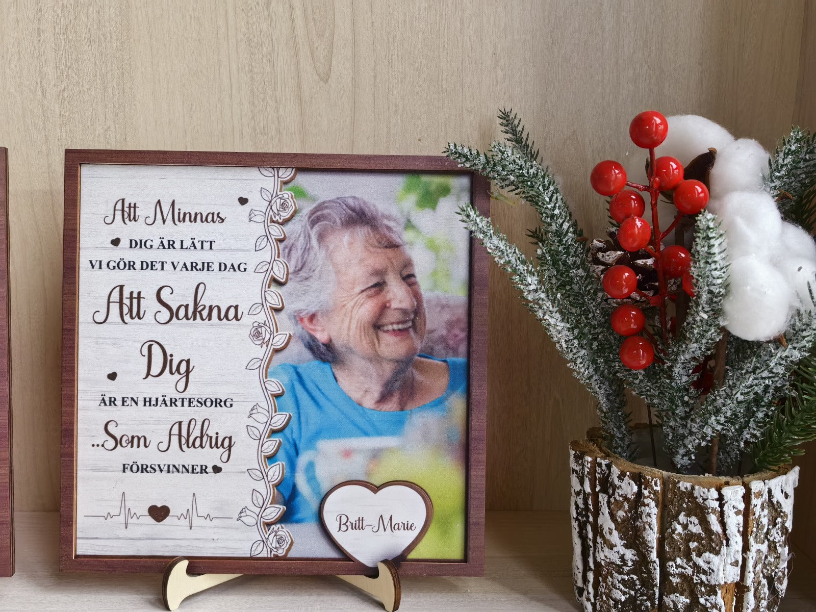 Denna personliga trätavla är inte bara ett föremål – det är en portal till en dyrbar tid, en hyllning till dem vi håller kära och saknar djupt. Genom att framkalla styrkan och värmen i ett älskat foto, skapar den här minnestavlan en ständig länk till de oförglömliga ögonblicken.