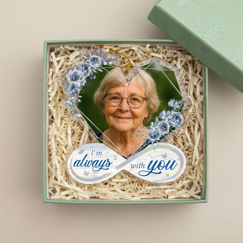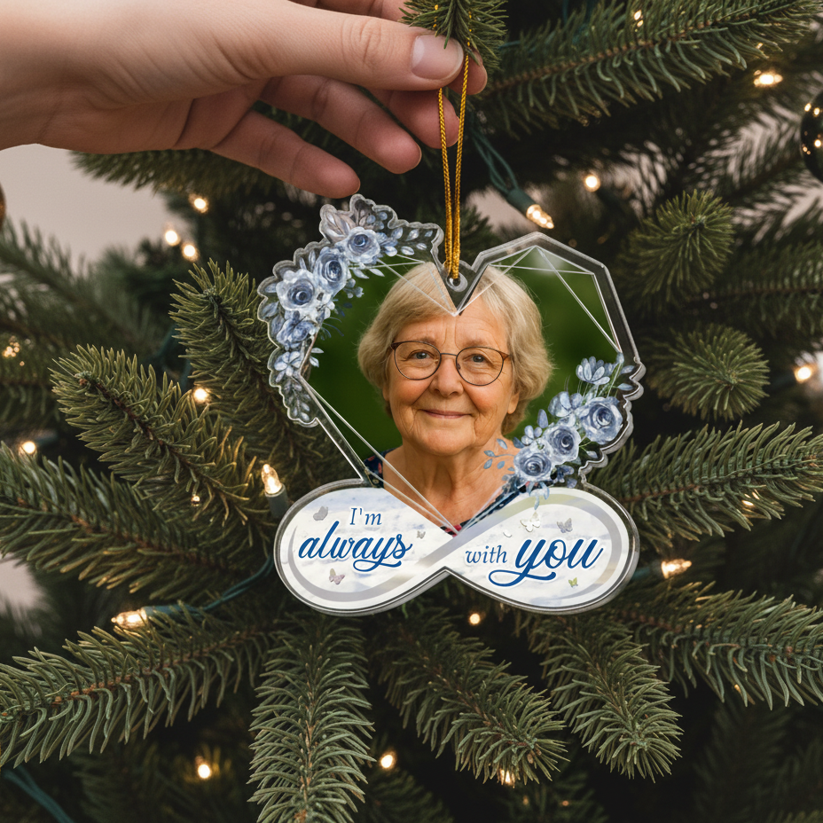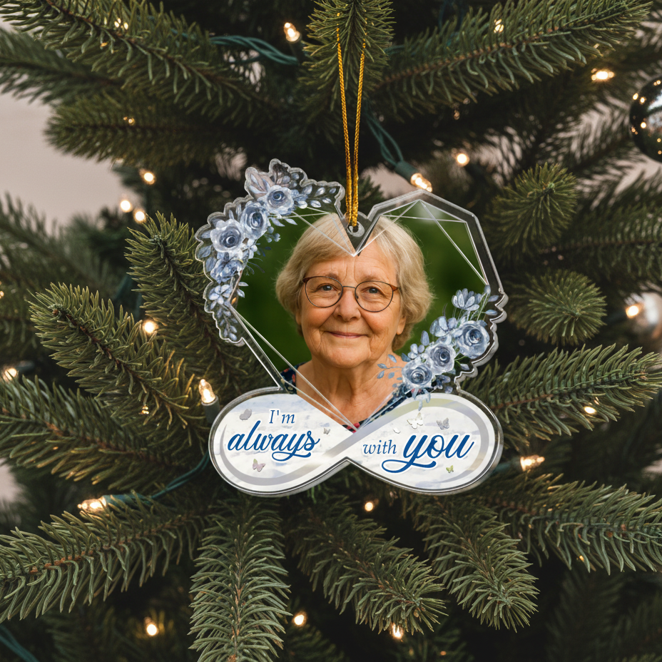 Upptäck vår Personliga Akrylprydnad med Foto! Denna vackra hjärtformade ornament låter dig föreviga dina käraste minnen och hålla dem nära. Med en elegant blommig design och texten "I'm always with you" blir det en rörande påminnelse om de vi älskar. Perfekt att hänga i granen eller ge bort som en hjärtevärmande gåva. Lägg till ditt eget foto för att skapa en unik prydnad som bevarar kärlek och minnen för alltid. Mer än bara en dekoration - det är en kärleksfull hyllning som håller dina kära nära hjärtat, varje dag.
