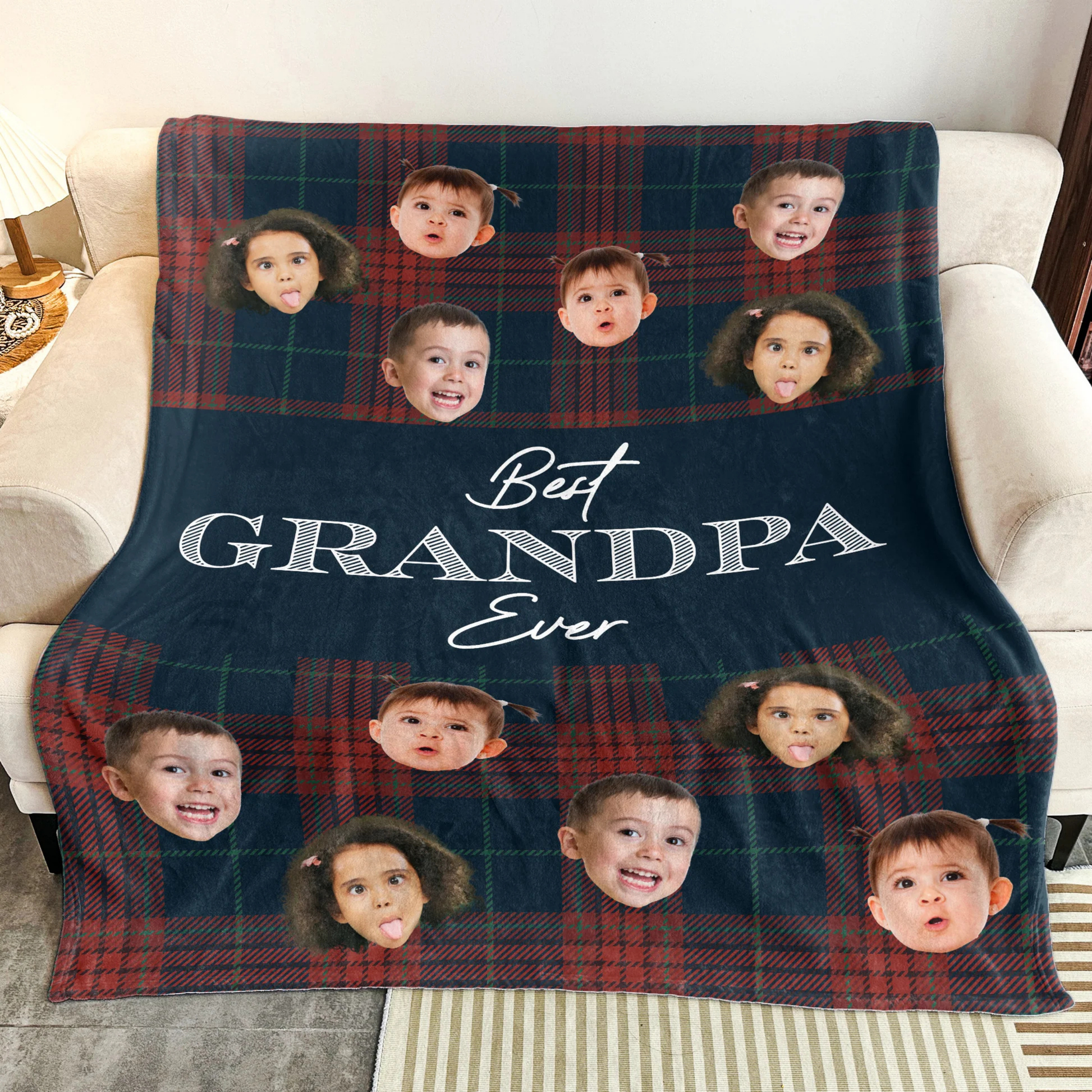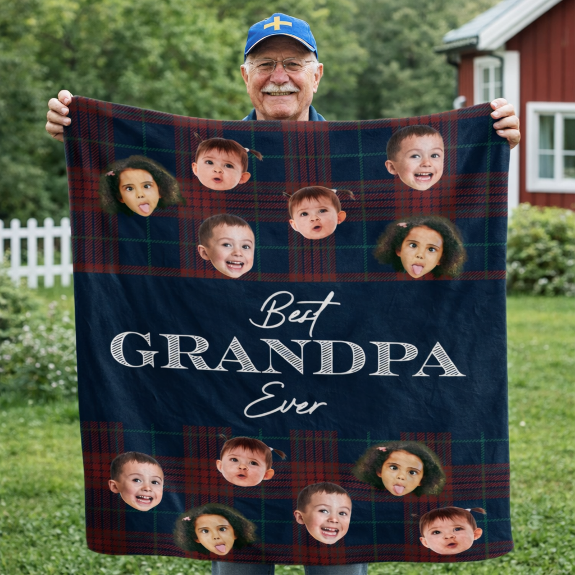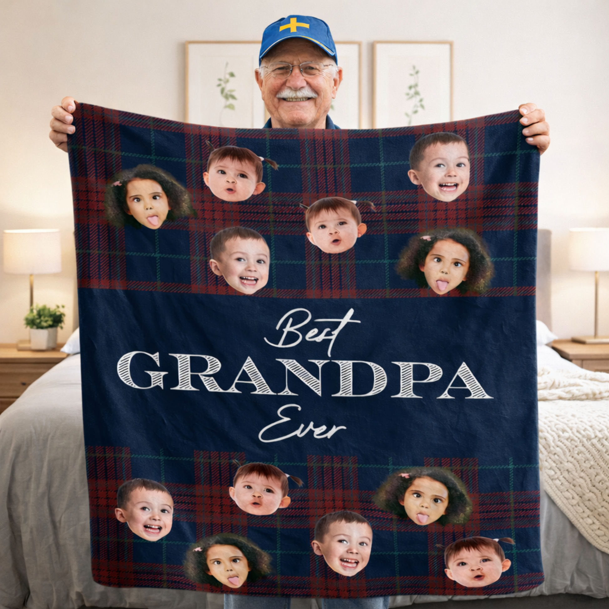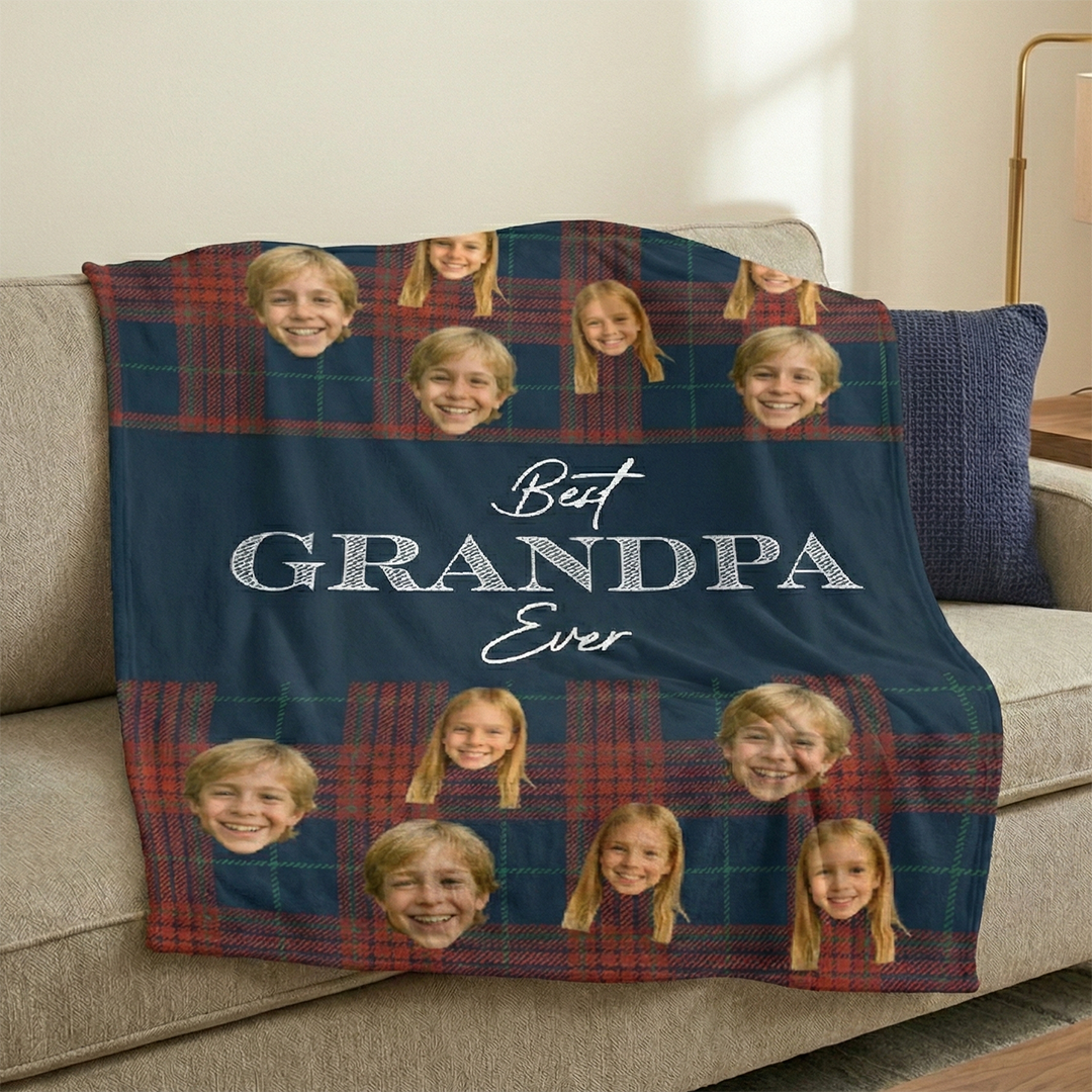 Den här personliga filten är gjord för mysiga stunder hemma, i stugan eller i soffan. Med barnens roliga ansikten blir den både varm och full av charm. En fin detalj som snabbt blir morfars favorit.