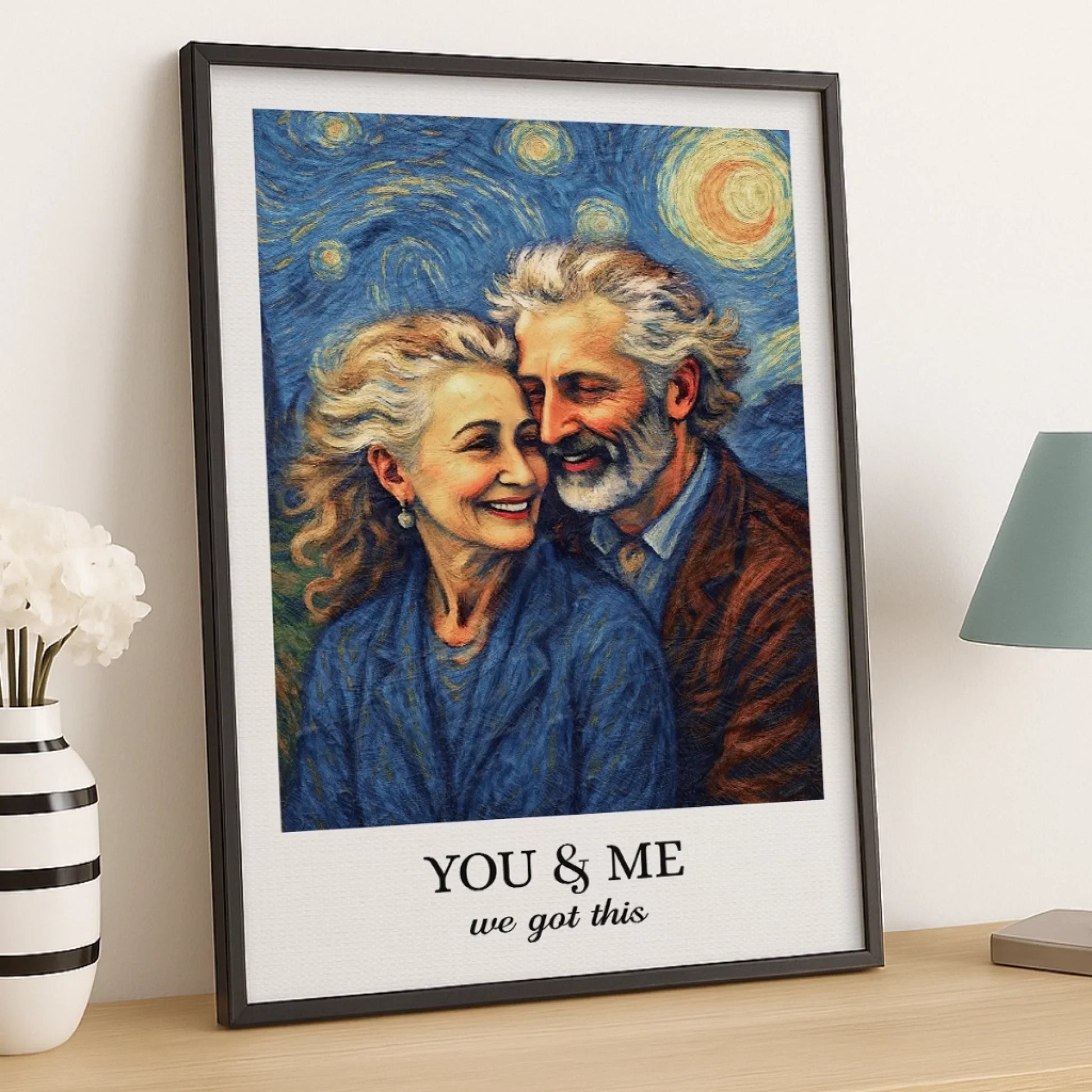 Ett porträtt i klassisk konststil blir ett varmt sätt att hylla någon du tycker om. Här förvandlas ert foto till en målning som känns både tidlös och personlig – något du gärna har framme varje dag.