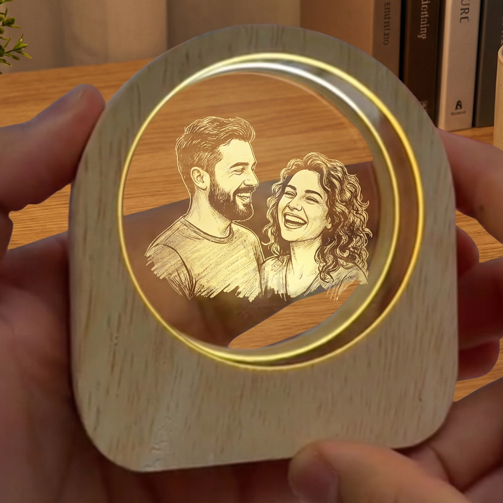 Välj en bild på två personer du vill lyfta fram, och vi förvandlar den till en elegant skiss som svävar i det klara glaset. Varje motiv bearbetas noggrant för att få fram känslan i uttrycken och skapa en harmonisk, personlig helhet.