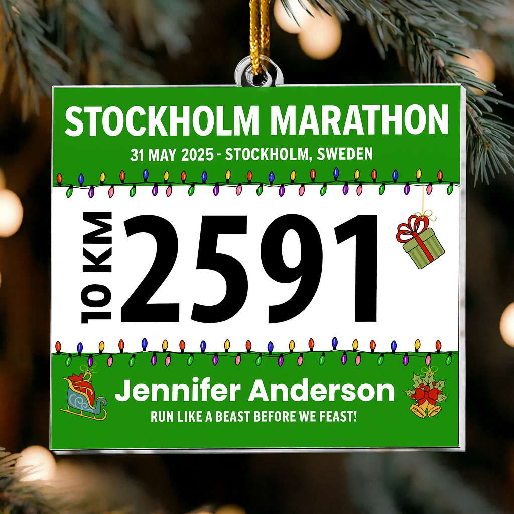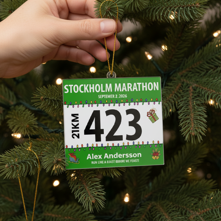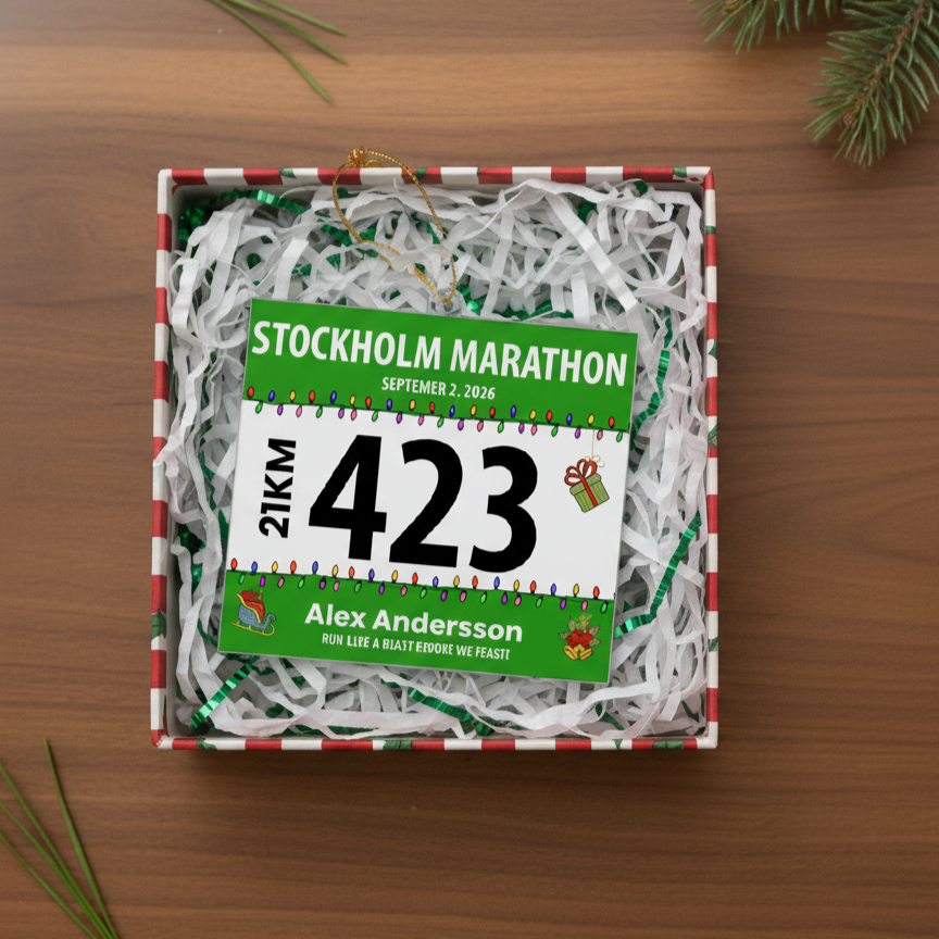 En personlig juldekoration för den som älskar löpning! Designen är inspirerad av ett riktigt maratonstartnummer och blir en rolig påminnelse om prestation, energi och glädje – perfekt för granen eller träningshörnan.