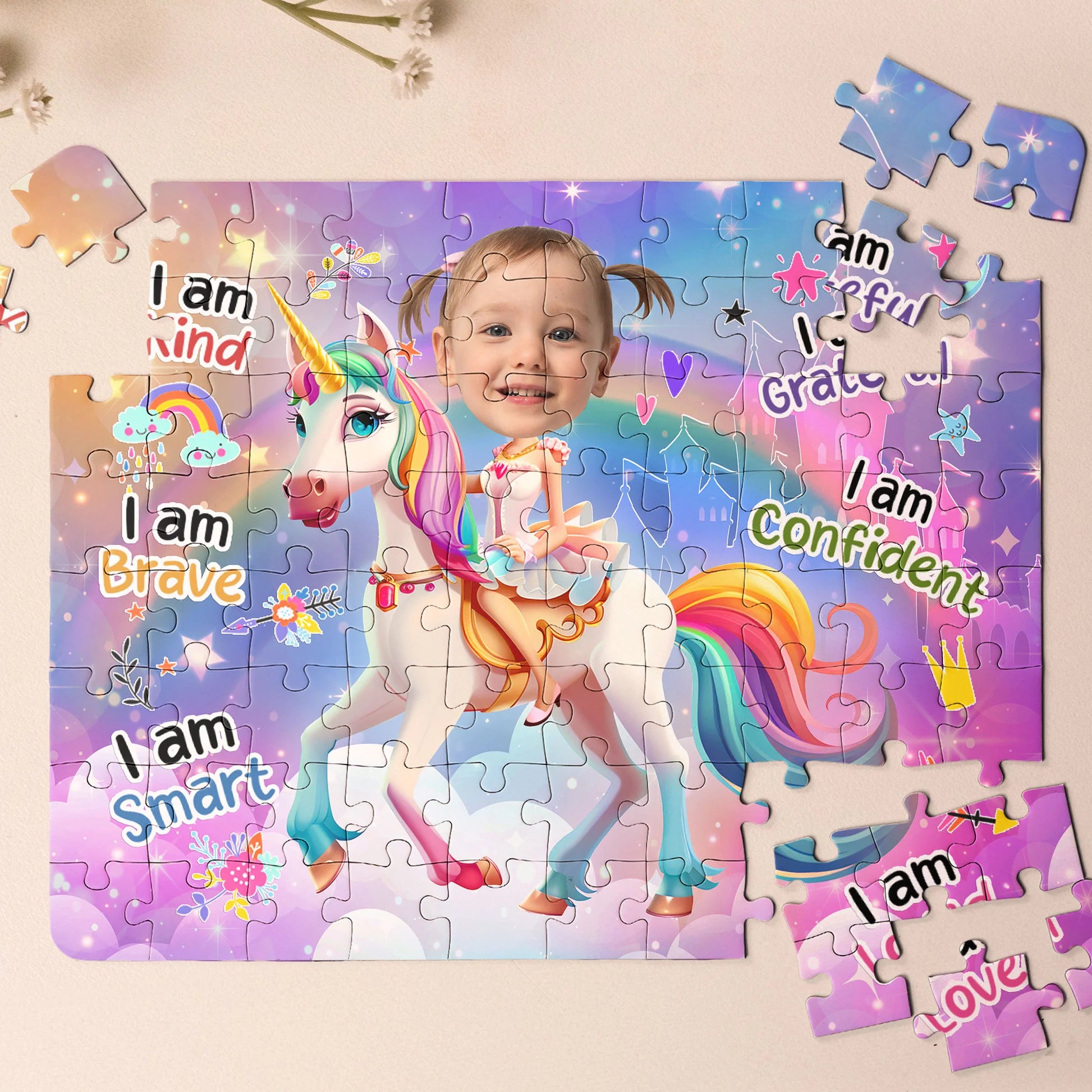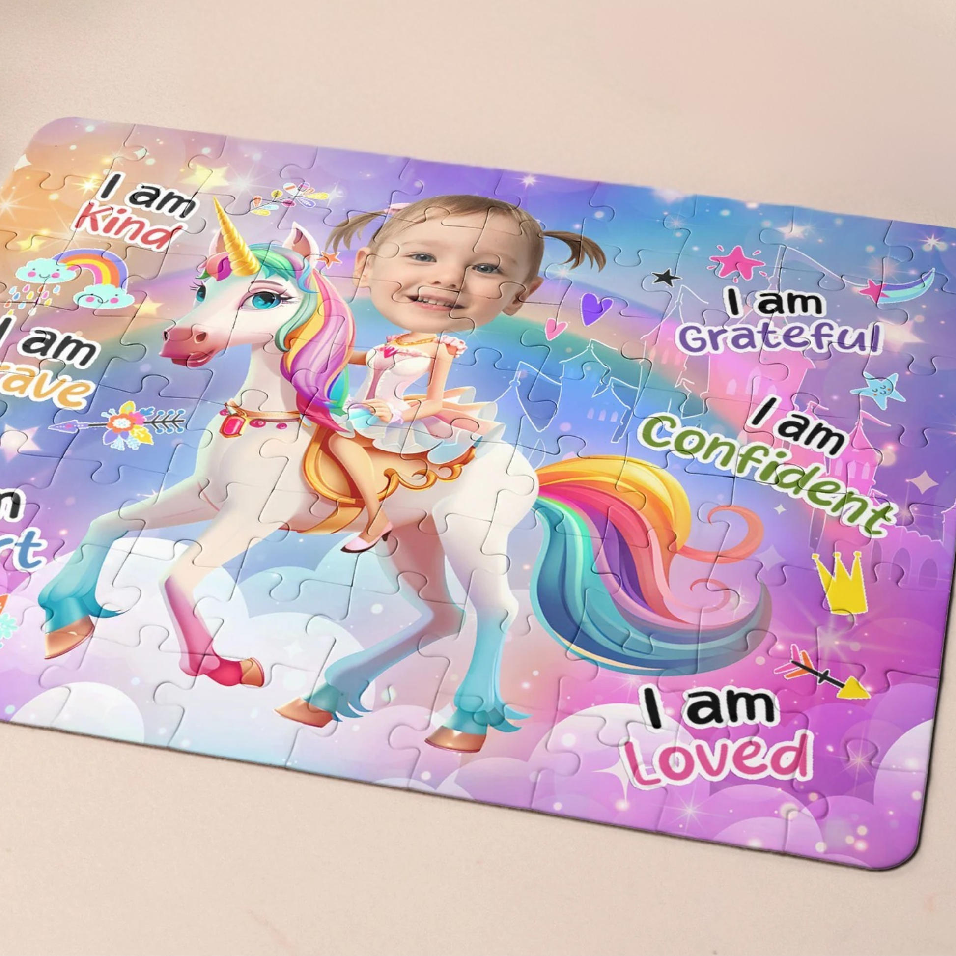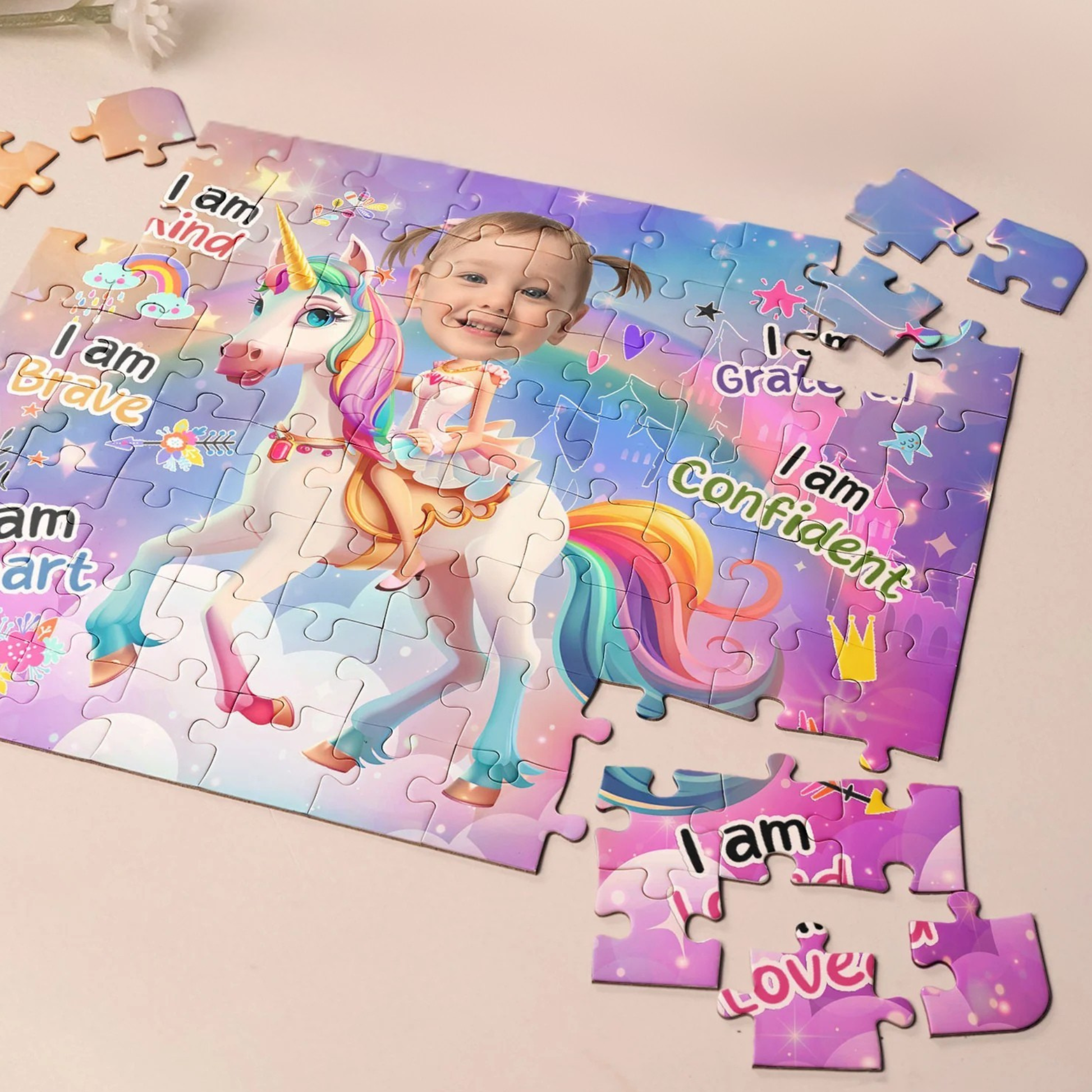 Ett färgglatt pussel som gör varje stund magisk! Låt barnet se sig själv som hjälten i sitt eget sagoland, ridande på en enhörning bland moln, regnbågar och stjärnor. Perfekt för lek, glädje och lite extra självkänsla.